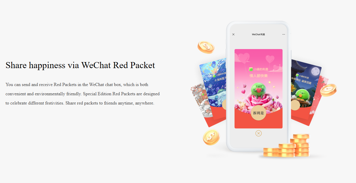 Эту функцию ввели в 2014 году в честь китайского Нового года. Она олицетворяла китайскую традицию обмена денежными пачками во время праздников. Функция позволила клиентам отправлять деньги контактам и группам в качестве подарков. При этом при отправке денег в группу можно распределять средства поровну или случайным образом. Только в первые 24 часа после запуска этой функции было отправлено 16 миллионов красных конвертов.