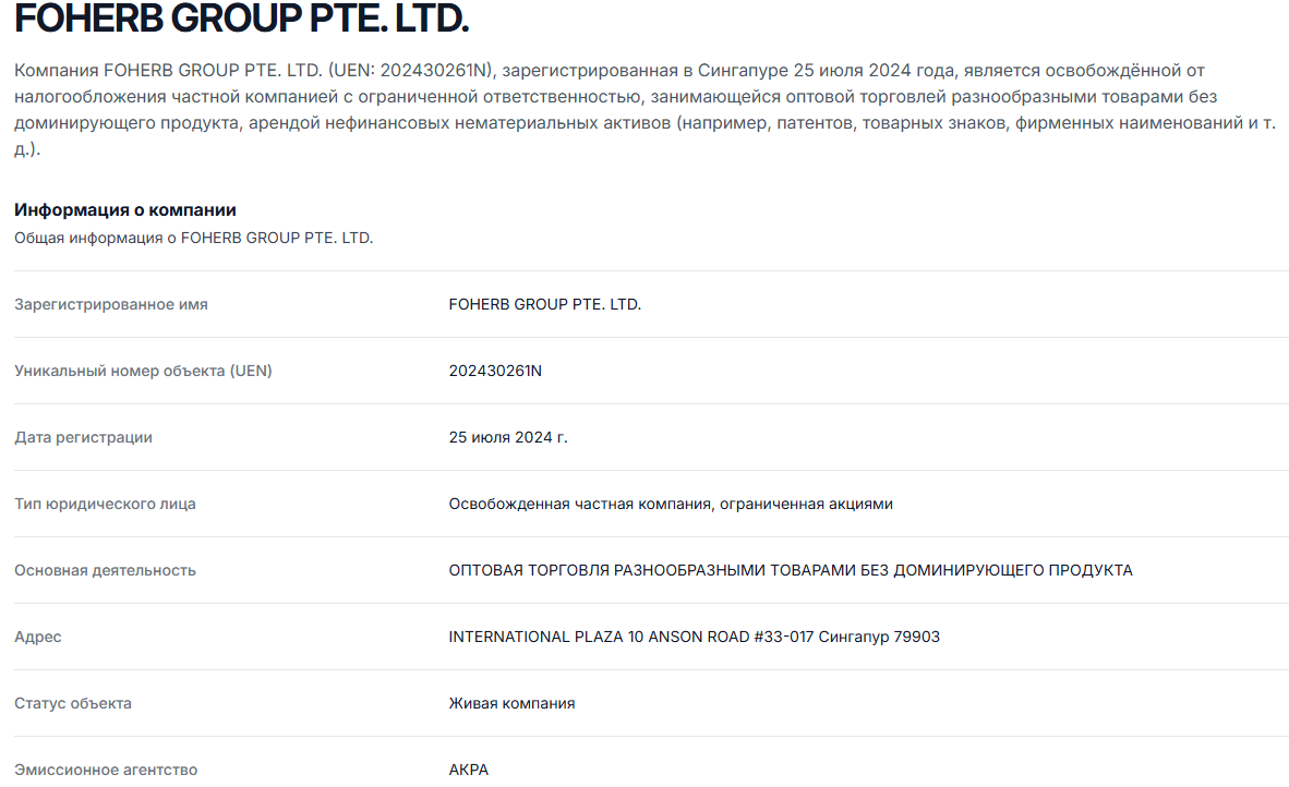 Но никаких подтверждений их слов мы не нашли. Вся информация может оказаться фейковой. Никто не объясняет в отзывах о Whieda что это за компания. Мы смогли найти только, что фирма FOHERB реально существует и зарегистрирована в Сингапуре в 2024 году. Но это еще больше вызывает вопросов. Работают они в основном в СНГ, а компания в Сингапуре.