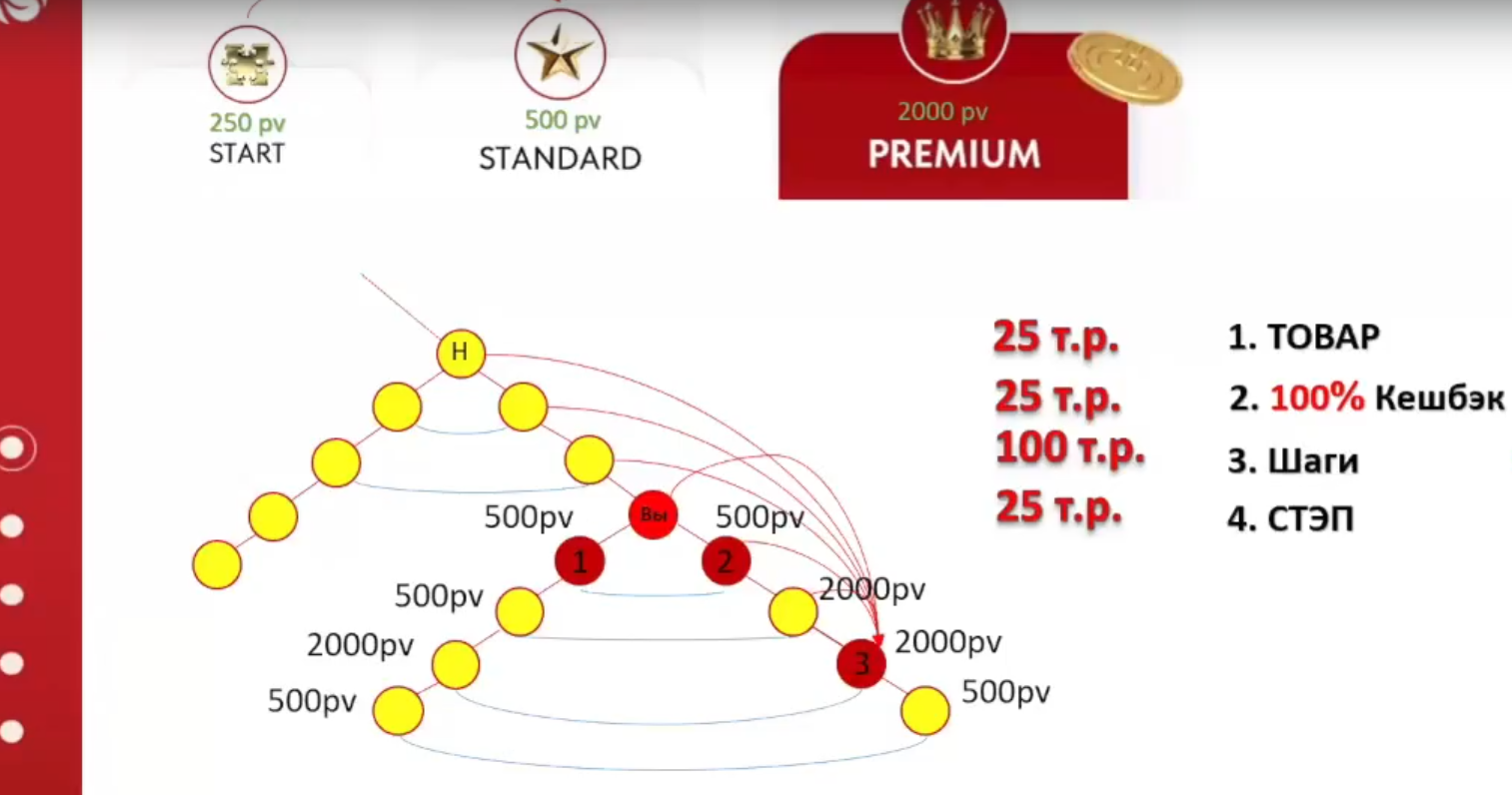 При регистрации дают 100% кэшбэк. Обязательных покупок нет. Активации не требуются. Переливы от спонсоров идут автоматом. Выводы ограничены. Максимум 3999 рублей за раз. Комиссия 5%, минимум 50 рублей. Заявку обрабатывают до 72 часов.