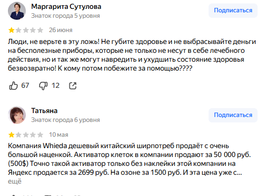 Некоторые в отзывах о лохотроне фирмы «Виеда» предупреждают о вреде здоровью. Приборы бесполезные и могут навредить. Не губите здоровье ради обмана. Главная проблема – сравнение цен. Активатор клеток от лохотрона Whieda стоит 50 тысяч рублей. Точно такой же на Яндекс Маркете – 2700 рублей. На Озоне – 1500 рублей. Разница в 30 раз.
