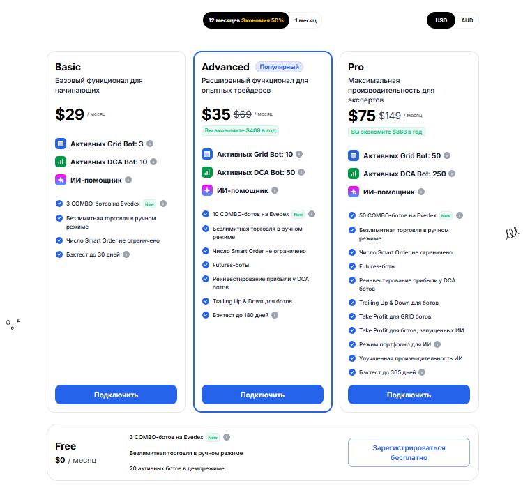 В рамках проекта есть возможность бесплатно подключить до 3 ботов на Evedex, а также запустить до 20 программ в демо-режиме. Для реальной работы этого будет недостаточно, а минимальная стоимость подписки составляет $29 – максимальный тариф доходит до $149, если не учитывать возможные скидки.