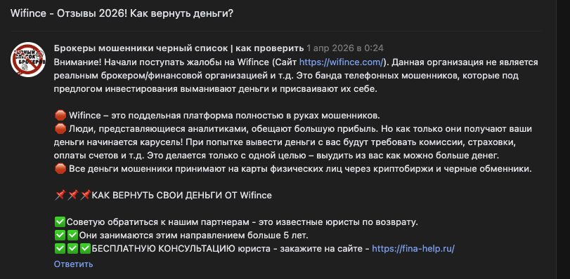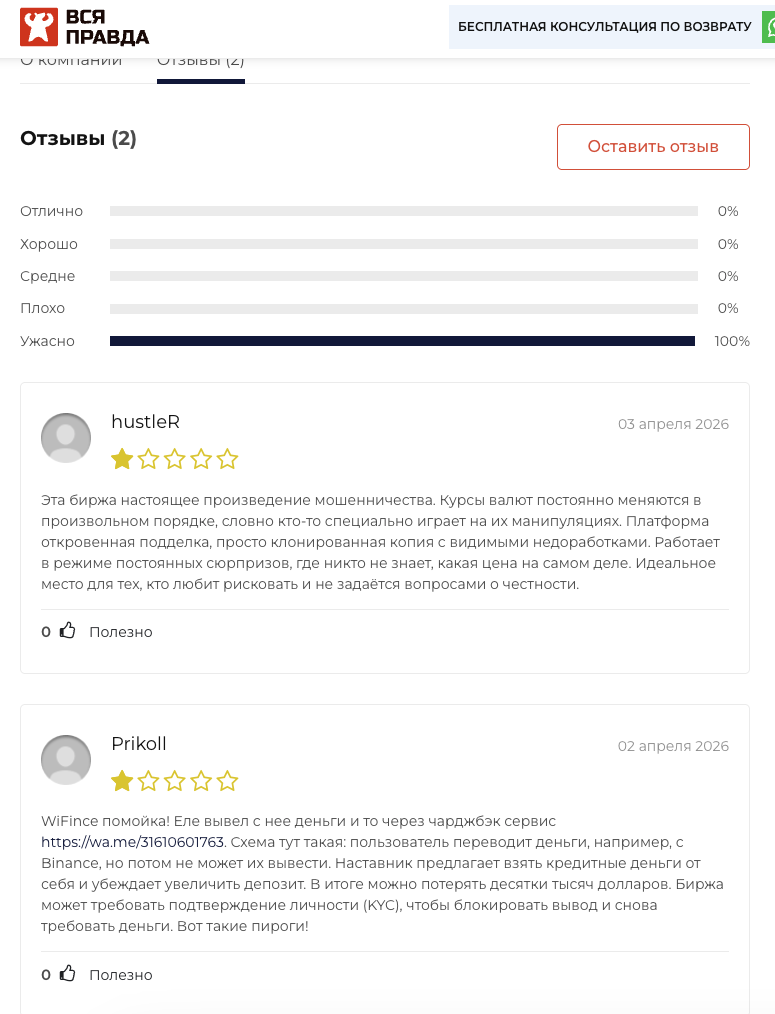 Проверка работы криптовалютной биржи WiFince: отзывы пользователей, что предлагается клиентам ВиФинсе