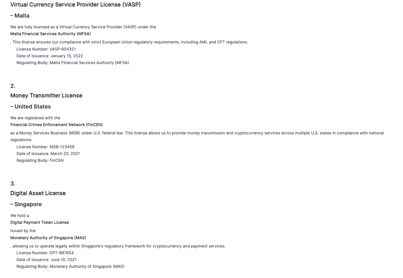 На сайте рассказывают о том, что имеют лицензию Мальты, Сингапура, США: