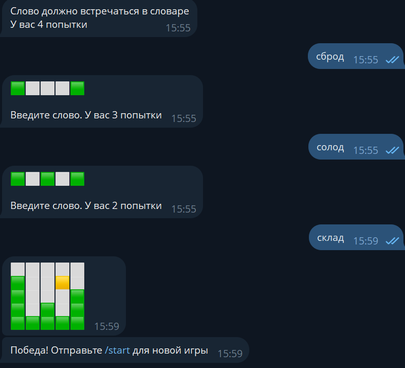 Wordle bot содержит игру, которая ведется по классическим правилам. Игроку дается 6 попыток для угадывания слова из 5 букв. Играть можно на английском и на русском языке. Изначально нужно просто вписать случайное слово и на основе подсказок угадывать загаданное. Если в введенном слове некоторые буквы совпадают по месту расположения с загаданным, то их наличие подсвечивается зеленым цветом. Если буква есть и в одном и в другом слове, но при этом они не совпадают по месту расположения, то Wordle бот подсвечивает их желтым.