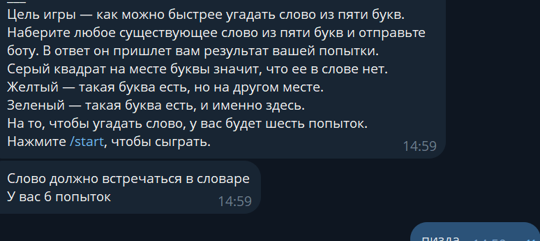 Мы провели анализ игры «Вордли» в Телеграме, оценили ее перспективы и изучили актуальное состояние. Игровой процесс полностью повторяет классический вариант, только представлен в удобном формате тг-бота. На основе проверки можно сделать такие выводы: