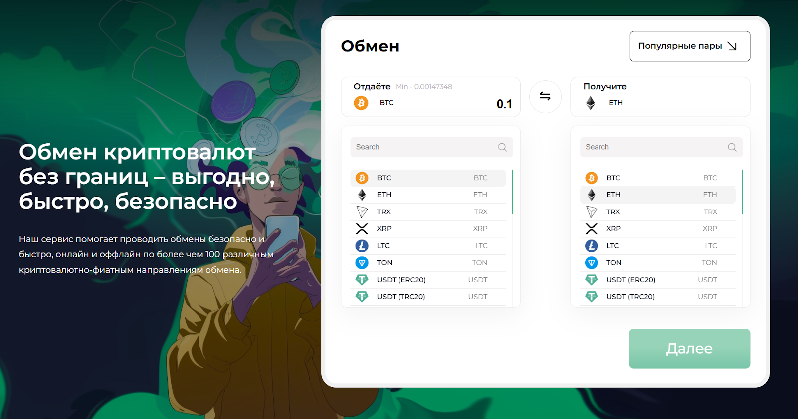 Процесс обмена начинается с выбора валюты для отдачи и получения. Далее платформа отображает актуальный курс, рассчитывает сумму заявки и комиссию. Для продолжения обмена клиенту необходимо заполнить форму с реквизитами получателя и отправить средства на адрес.