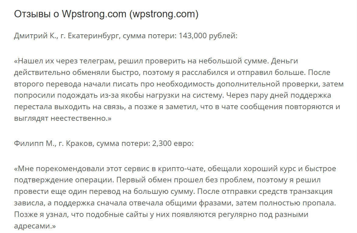 В интернете уже начинают появляться негативные отзывы о Wpstrong com. Пользователи сообщают о зависании транзакций на неопределенное время после отправки средств. Поддержка может ответить общими фразами, но чаще всего сотрудники просто не выходят на связь.