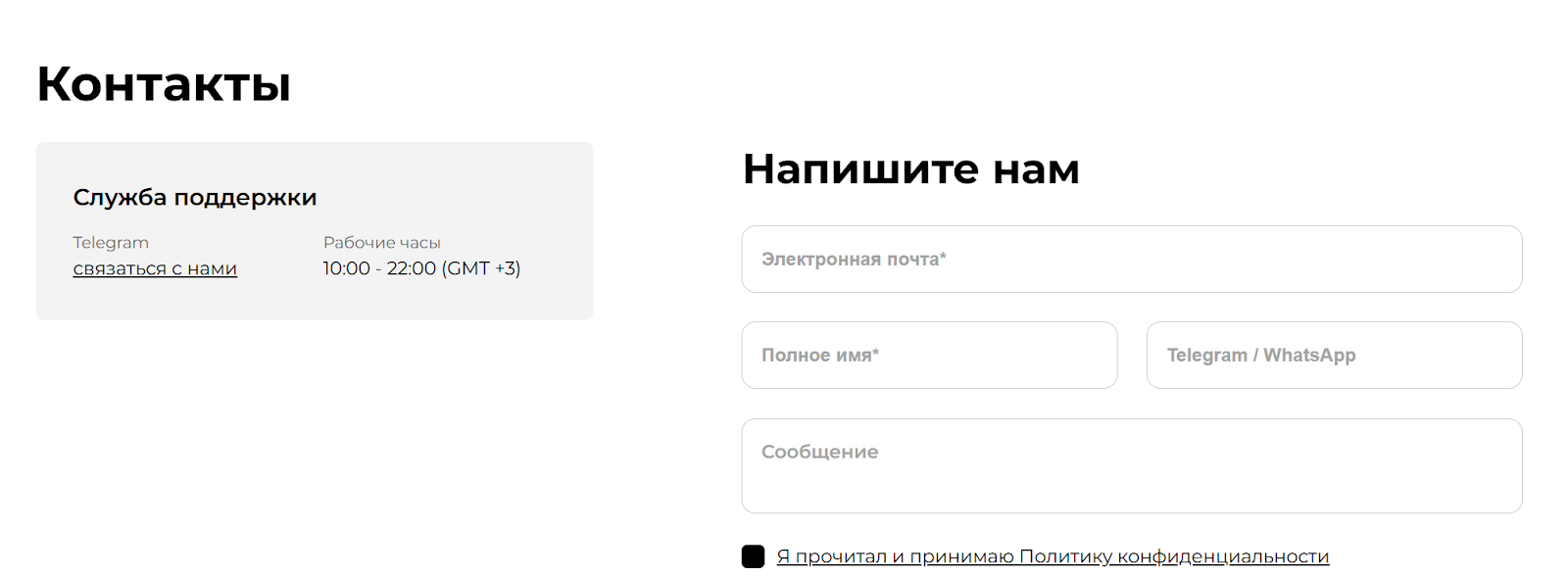 В качестве поддержки предоставлен единственный контакт в Телеграме. Канал связи работает с ограничениями по времени – 10:00-22:00 UTC+3. Сведений о правовой форме фирма не раскрывает. Ссылок на лицензии от финансовых регуляторов также не приводится.