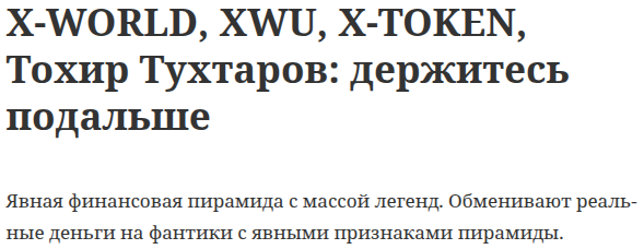 Единственный обнаруженный отзыв об инвестиционной платформе X Token носит резко негативный характер. Пользователь связывает платформу с группой финансовых пирамид, включая X-WORLD и XWU. Он пишет о том, что схема привлечения депозитов каждый раз дублируется.