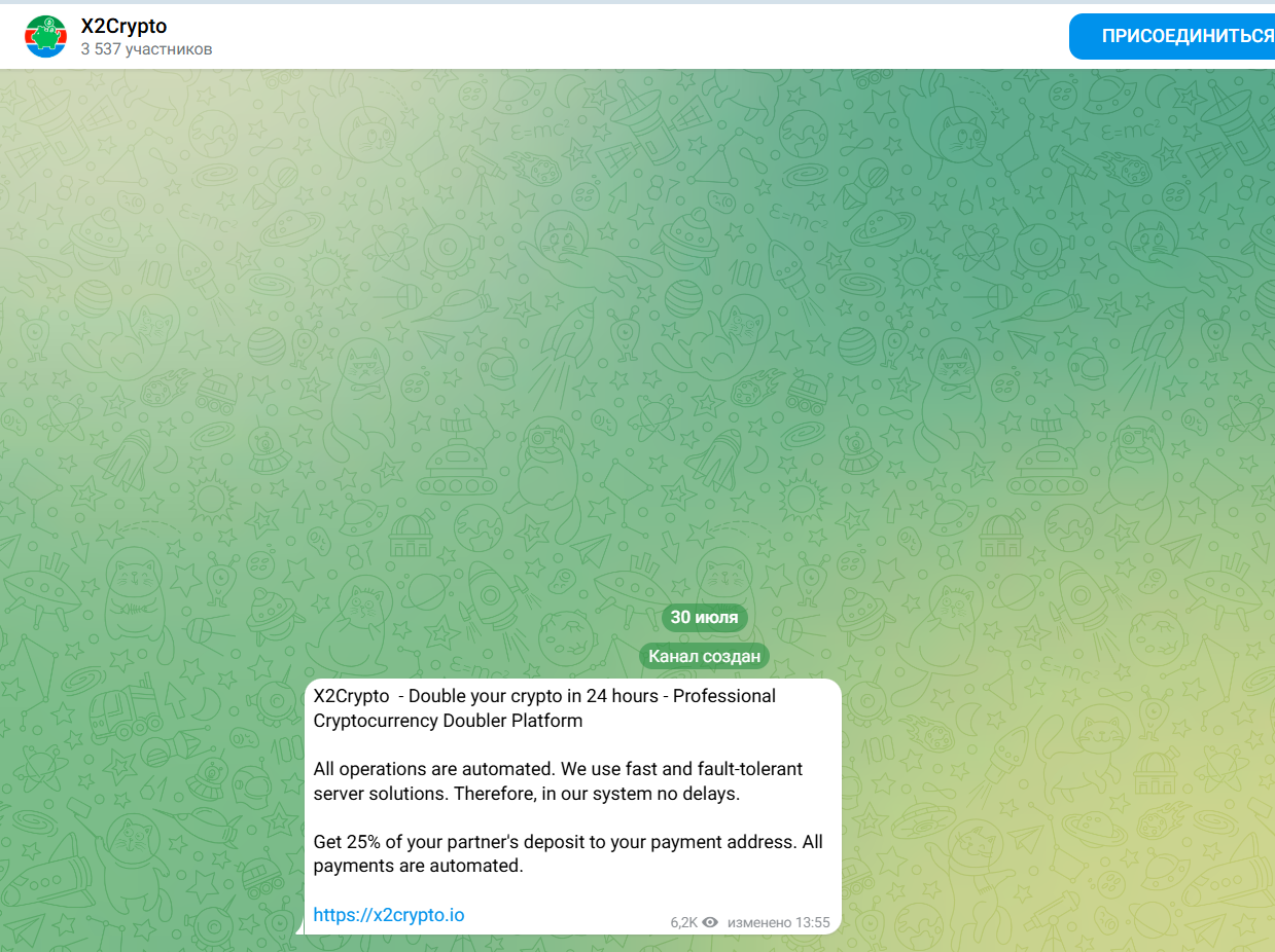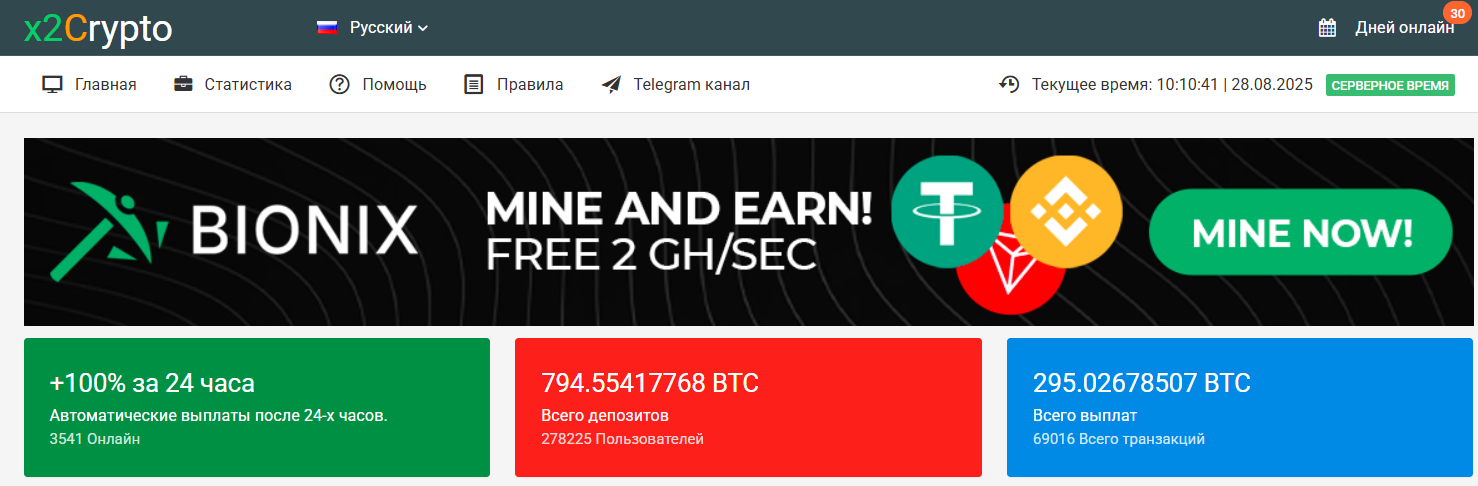 X2Crypto называет себя “профессиональной платформой удвоения криптовалюты за 24 часа” — то есть деньги будто растут сами, стоит только закинуть депозит. Внесли биткойн, дог, лайт, эфир или USDT — и через сутки обещают вернуть в два раза больше.