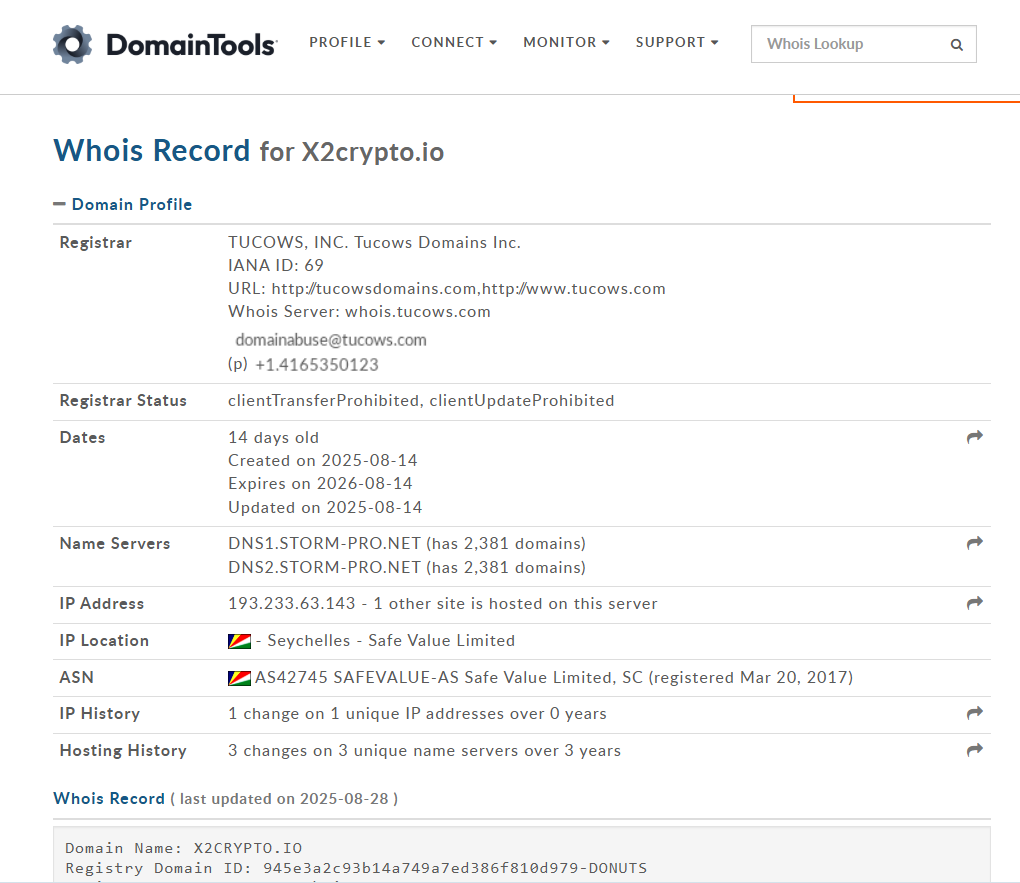 Домен свежий, владелец скрыт, инфраструктура анонимна и расположена в юрисдикции, где активности регуляторов и прозрачность минимальны.