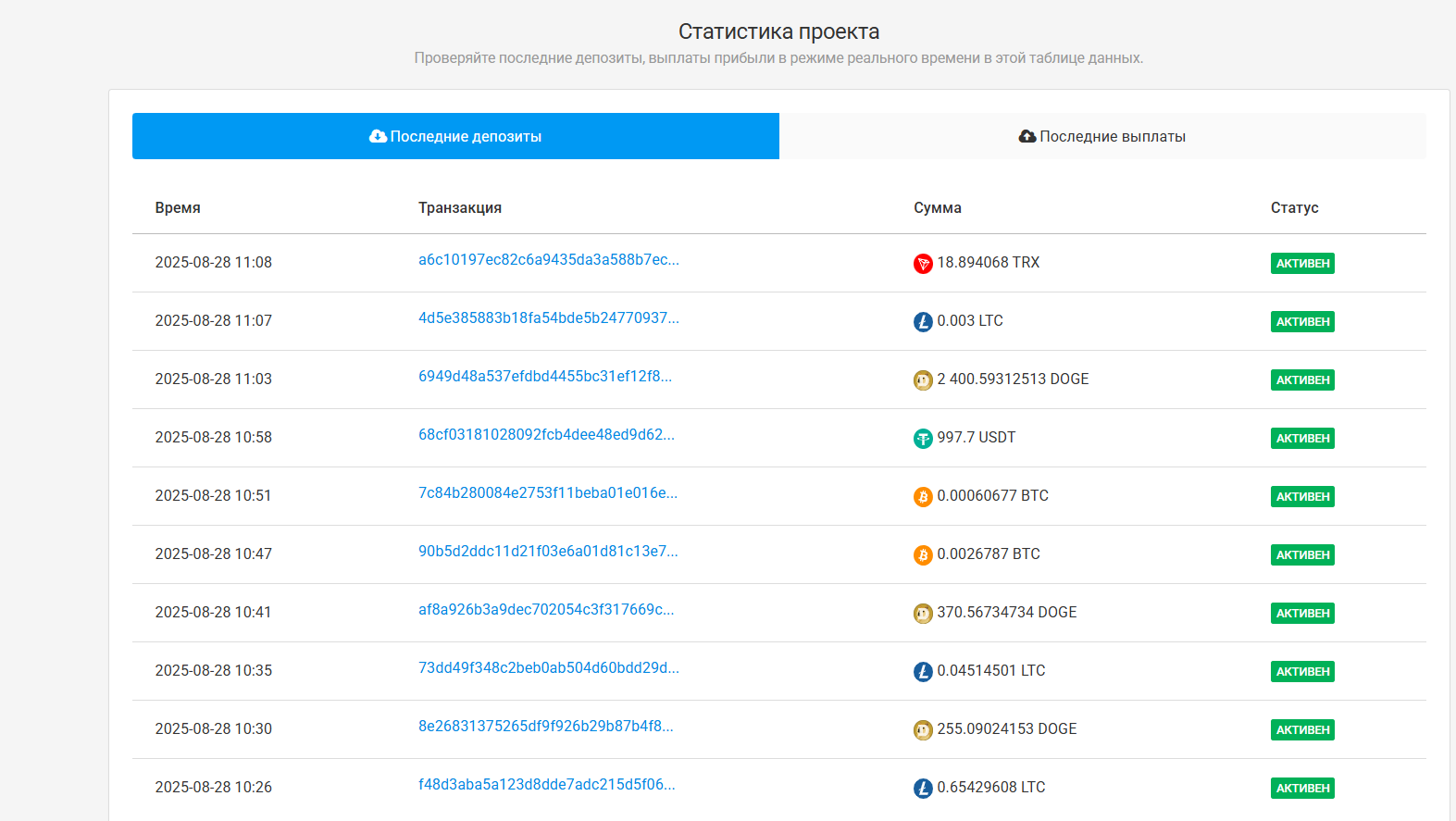 Примеры транзакций на странице (фрагменты хэшей и суммы в DOGE, BTC, USDT и LTC) выглядят правдоподобно на первый взгляд, но без возможности безошибочно сопоставить эти хэши с реальными on-chain переводами их нельзя считать доказательством.