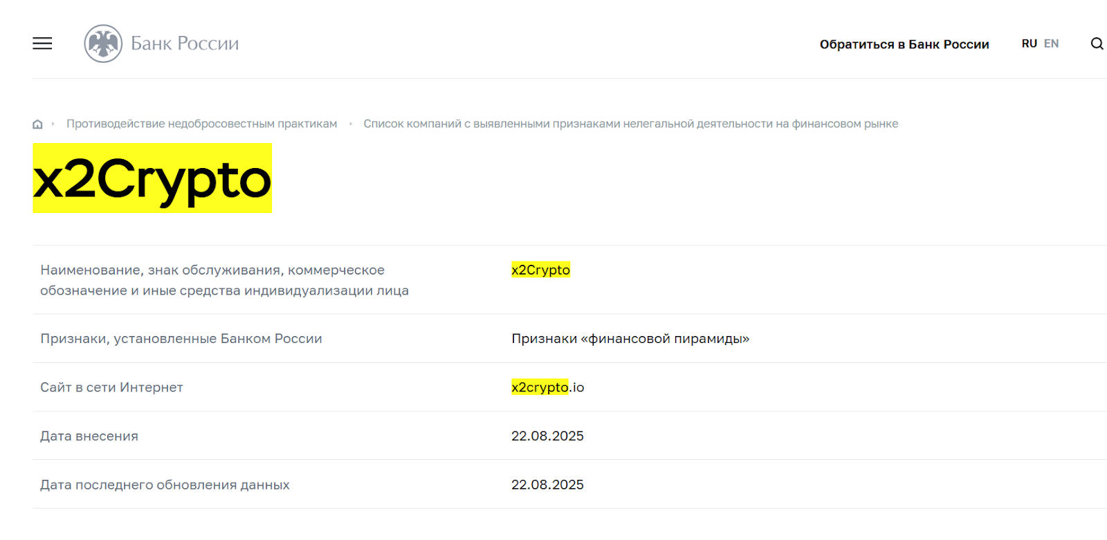 Однако в данном случае это и не требуется — Банк России уже внес проект в список с признаками финансовой пирамиды. Такой официальный вердикт говорит о надежности информации гораздо убедительнее любых комментариев в интернете.