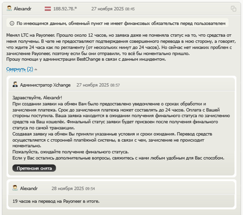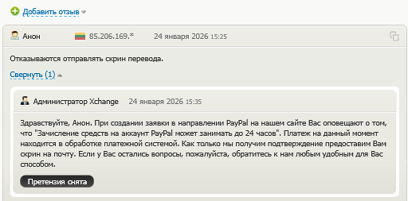 Есть и отрицательные отзывы о работе XChange. Большинство из них касается длительных сроков обмена по некоторым направлениям. Но в регламенте сервиса указано, что операции с отдельными платежными системами могут занимать до 24 часов. В данной ситуации речь идет, скорее всего, о невнимательности клиента и особенностях работы обменника.