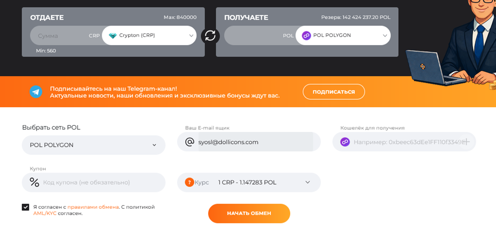 - возможность обмена валюты на сайте или через бота в Телеграмм;