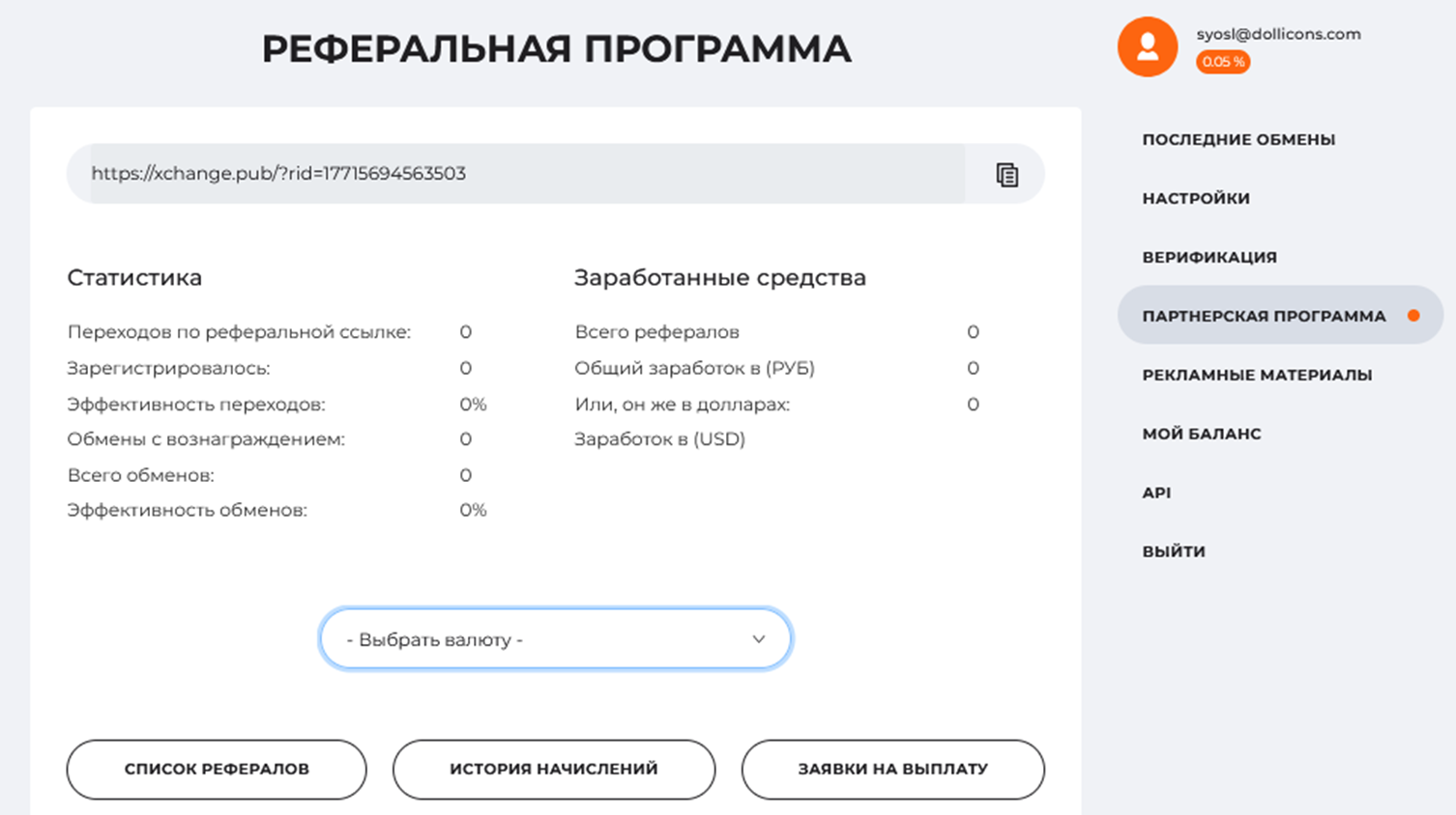 В разделе с партнерской программой можно контролировать информацию обо всех начислениях и балансе, поставить заявку на вывод. Доступна полная статистика, данные по всем рефералам.