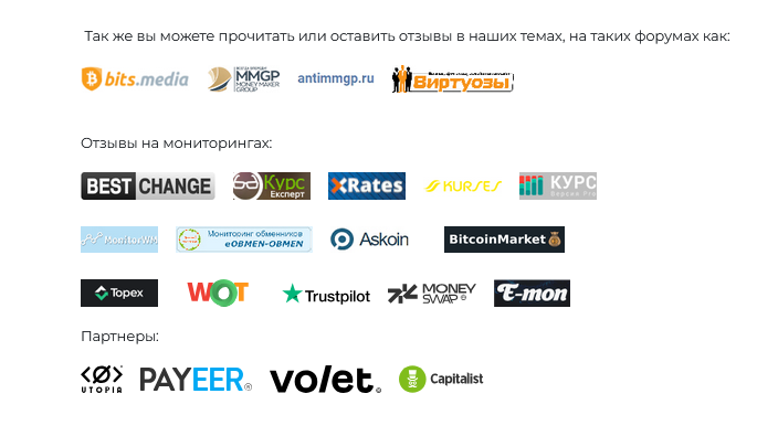 Дополнительно клиенты могут оставлять сообщения на тематических форумах, где у обменника есть собственные ветки. Полный список таких партнерских сервисов есть на сайте.