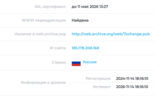 Проверка сайта XChange Pub показывает, что домен зарегистрирован в России в 2024 году. Это соответствует официальному заявлению администрации сервиса о полном обновлении платформы.
