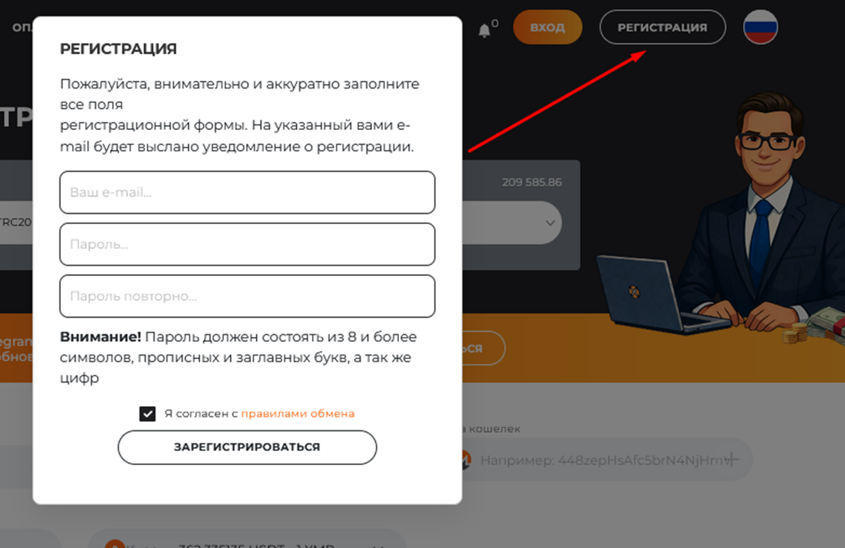 Для того, чтобы воспользоваться всеми функциями обменки, рекомендуется открытие личного кабинета. Для этого нужны минимальные данные – адрес электронной почты и пароль.
