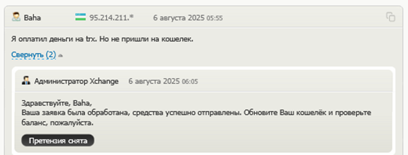 По опубликованным отзывам об XChange Pub видно, что саппорт быстро реагирует на такие замечания. Вопросы с получением средств решаются, клиенты снимают претензии.