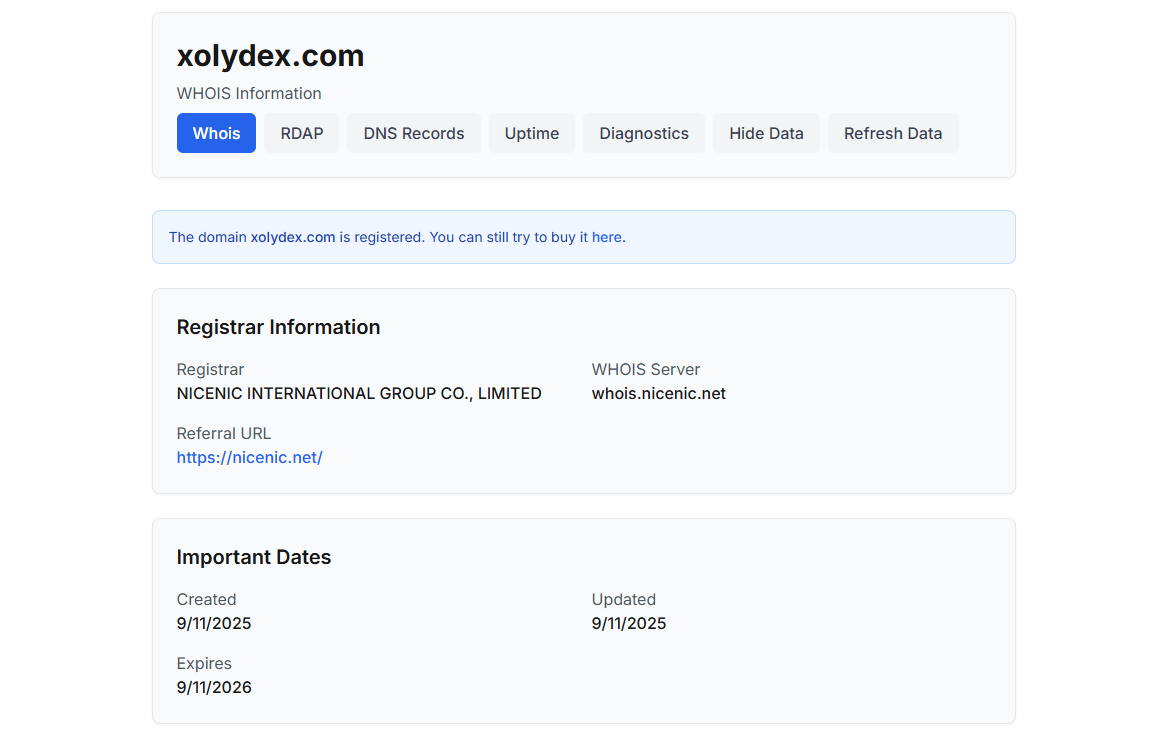 Согласно данным Whois, домен биржи был зарегистрирован в середине ноября 2025 года через регистратор Nicenic International. Из информации в интернете известно, что сайт XolyDex com был оформлен по классическому шаблону: сотни торговых пар, возможность стейкинга, реферальная программа и декларируемые низкие комиссии. При этом на ресурсе отсутствовали упоминания о лицензии и сведения о компании-операторе. Контакты были ограничены онлайн-чатом, а данные о руководстве не указаны.