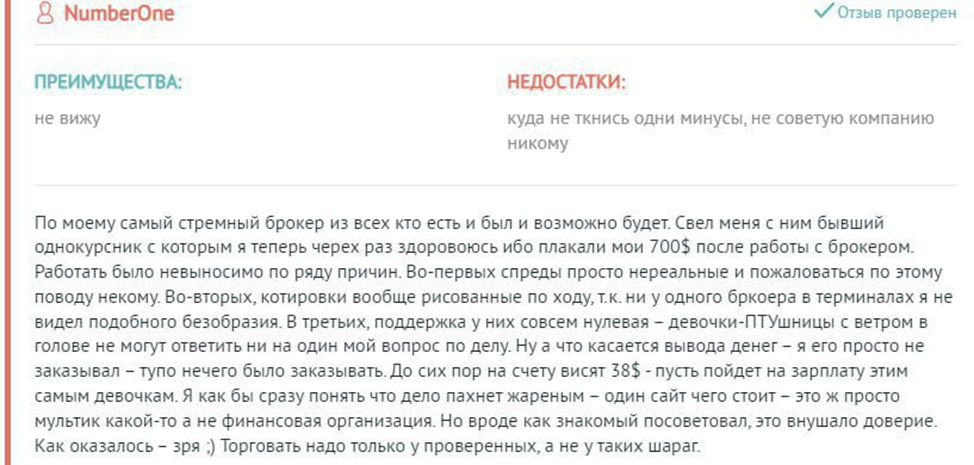 Худшего брокера я не встречал! По началу конечно вежливо общается и отвечает на вопросы. Но стоило мне внести первый платеж, как все резко изменилось! Решил выводить средства, но после этого меня заблокировали! Верните деньги, жулики!!!!