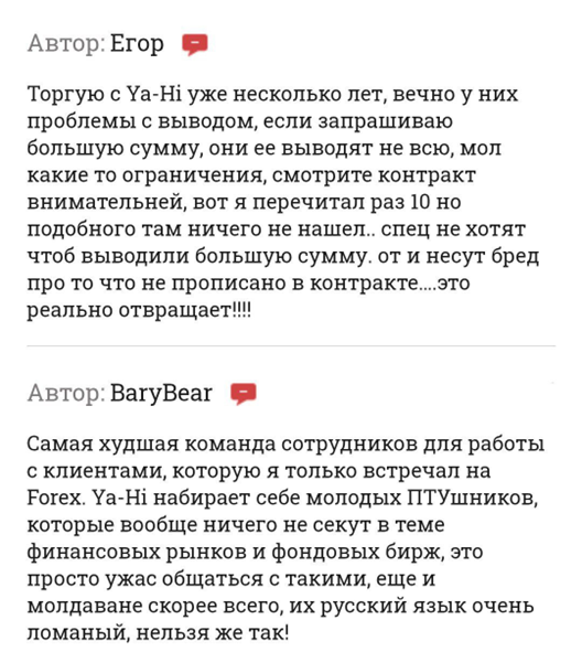 Отзывы о брокере YaHi отрицательные. Пользователи утверждают, что спреды просто нереальные, котировки рисованные, а поддержка нулевая. Если инвестор запрашивал на вывод большую сумму, то всю ее не выводили. Уверяли, что есть какие-то ограничения, хотя на сайте об этом не было указано. А русский язык у менеджеров был ужасный. Если получалось с ними пообщаться, то было очень тяжело.