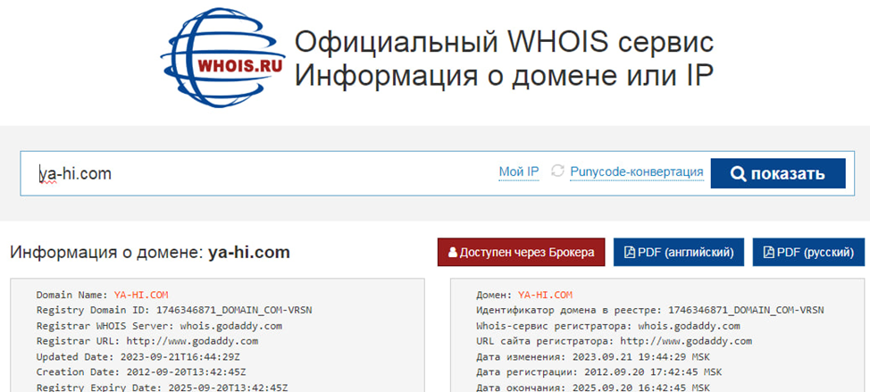 Домен создан в 2012 году, хотя брокер начинал работу в 2008. Также, никакие файлы на данный момент не привязаны к этому адресу. В 2023 году «Я Хи» перестал действовать на этом домене. Поэтому, скорее всего, произошла типичная смена имени. Так ведут себя мошенники.