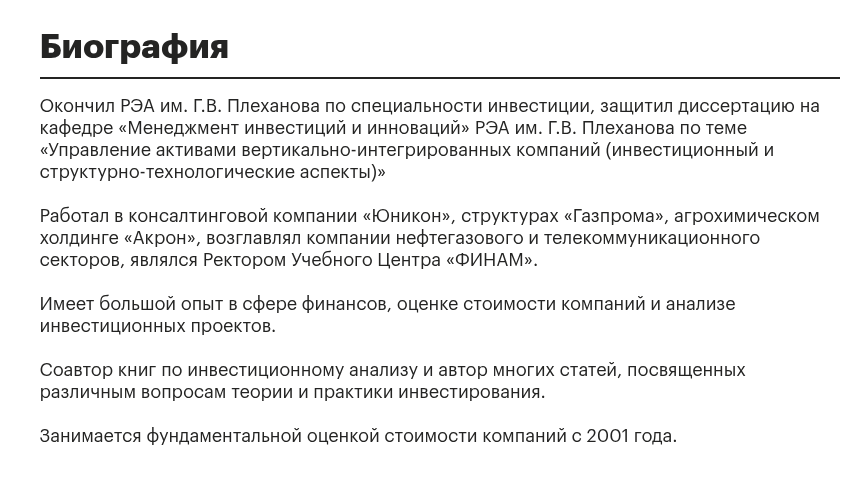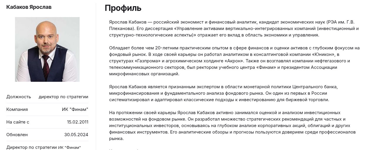 Ярослав Кабаков – это, без сомнений, не скамер и не инфоцыган. Перед нами настоящий топ-менеджер с серьезным опытом работы в финансовой индустрии. Проблема здесь в том, что его публичная деятельность имеет мало общего с бескорыстной помощью розничным инвесторам. Главная задача аналитика – продвижение бренда «Финам» и его продуктов. Любые прогнозы Кабакова, стратегии и обучающие материалы нужно пропускать именно через этот фильтр.