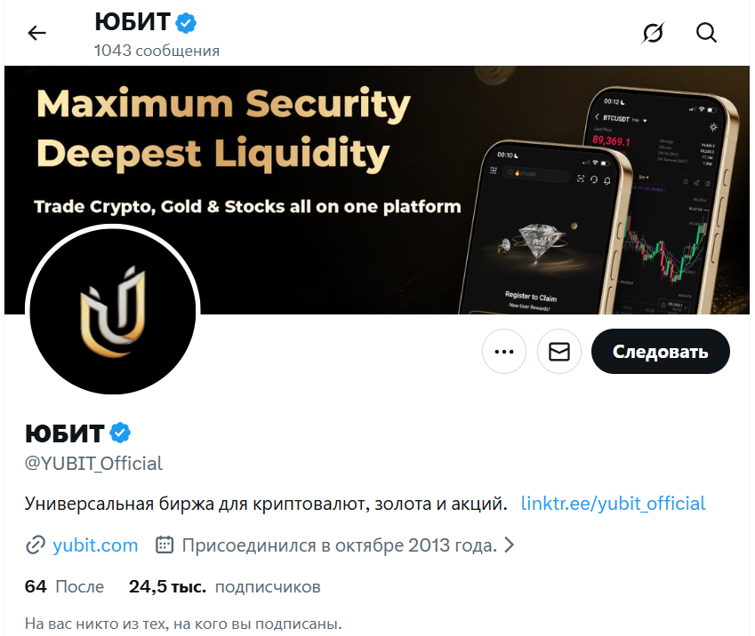 В Твиттере представлен аккаунт в Твиттере — YUBIT_Official. К нему подключено около 24,5 тыс. человек. Новые записи добавляются регулярно. В них приводятся сведения об актуальных инструментах для торговли и их возможностях для трейдеров.