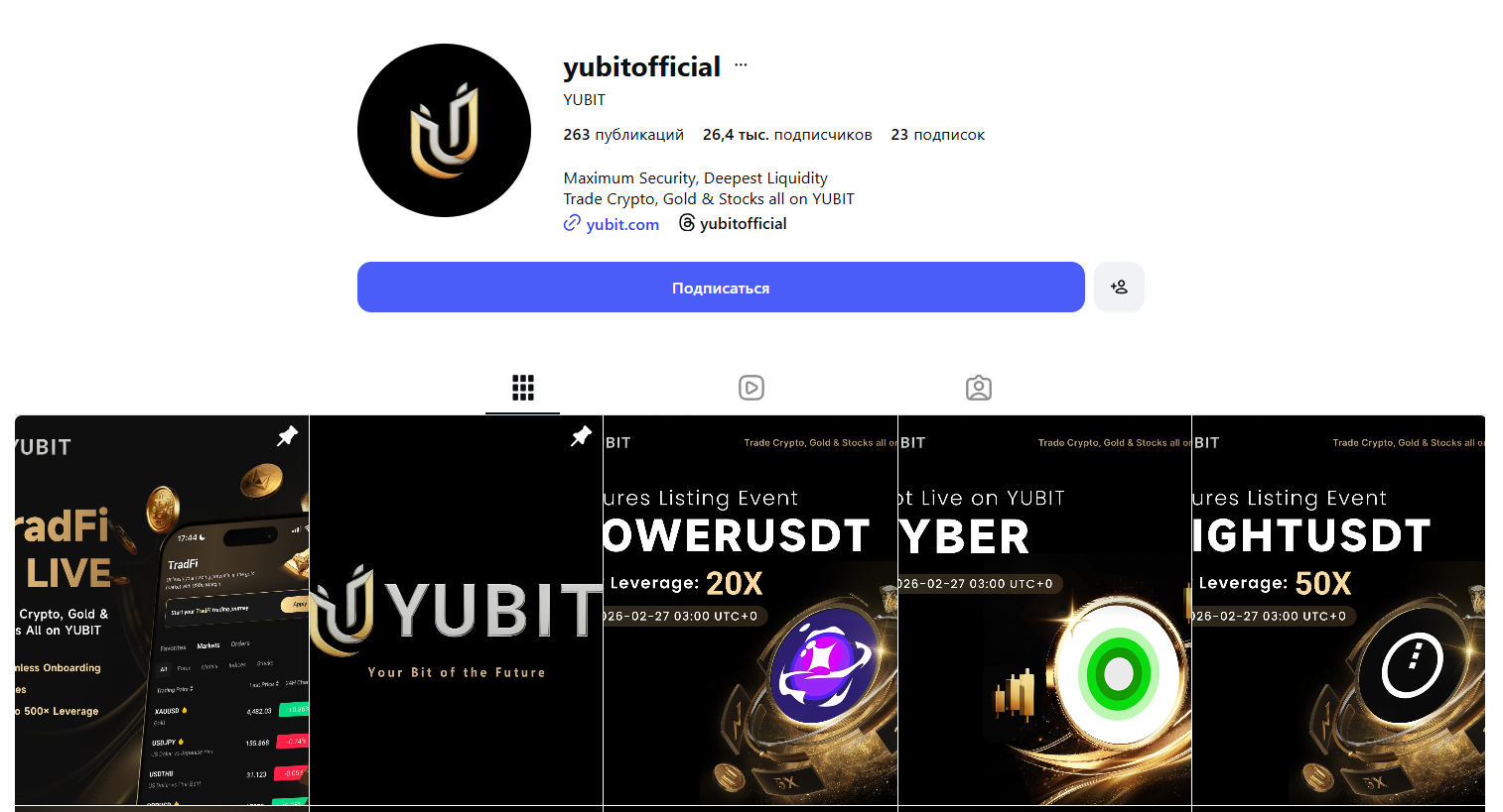 Не менее популярным является профиль в Инстаграм — yubitofficial. К нему подключено около 26,4 тыс. пользователей. При этом число публикаций за все время превысило отметку в 260.