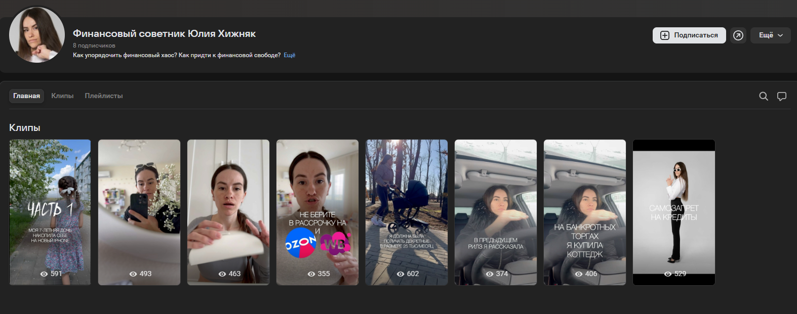 На начало 2026 года у девушки нет активных соцсетей по типу ВКонтакте, Инстаграм, FB или X. Нам удалось найти ее канал на Rutube с 6 подписчиками и короткими роликами по теме финансов.
