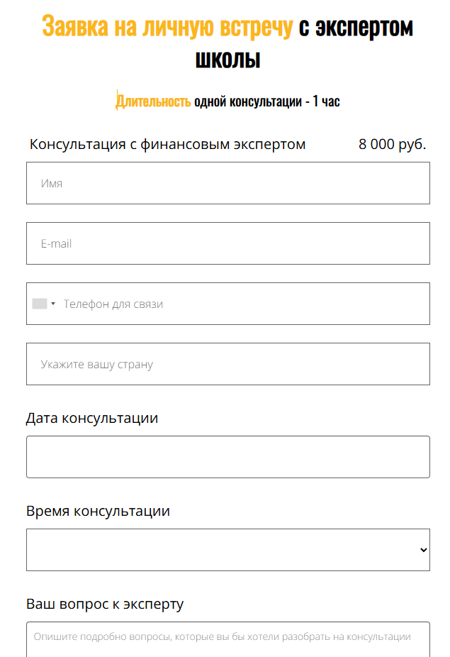 На начало 2026 года на сайте школы Егора Арсланова есть услуга платной консультации от Юлии. Студенты и выпускники могут заполнить форму для связи с менеджером, если их устраивает цена. Им предлагают часовой эфир за ₽8,000.
