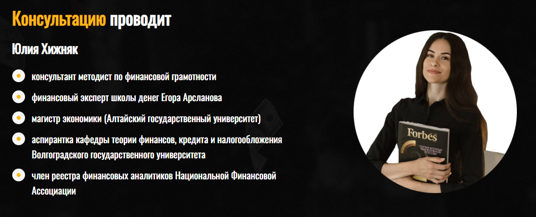 Обзор наставника Юлии Хижняк: отзывы клиентов, обучающие курсы, условия работы с Yuliya Hizhnyak, гарантии для учеников школы Арсланова Егора Даниловича