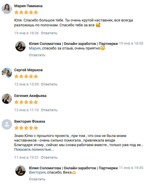 Отзывы о курсах Юлия Соломатова в основном размещены внутри сообществ ВКонтакте и Телеграме. Пользователи благодарят Юлию за наставничество, ясность подачи материала, а также вдохновение. Встречаются заявления о доходах в десятки и сотни тысяч рублей.