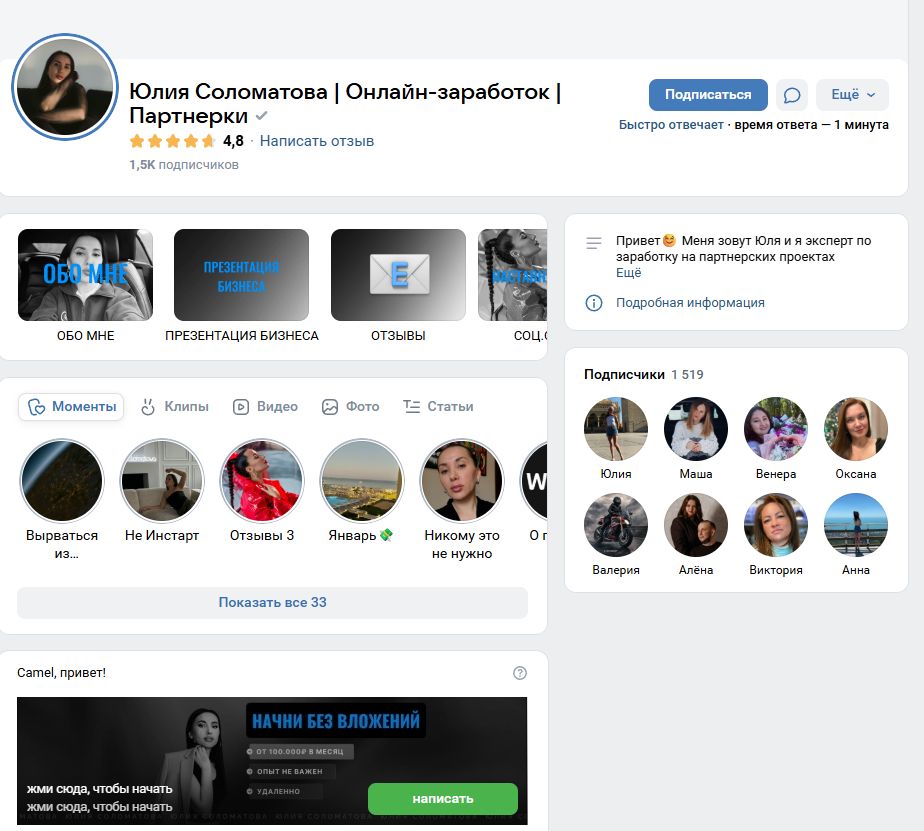- на сообщество ВКонтакте «Юлия Соломатова | Онлайн-заработок | Партнерки» (solomatovamoney) подписано 1,5 тыс. человек. Контент примерно тот же, что и в Телеграме.