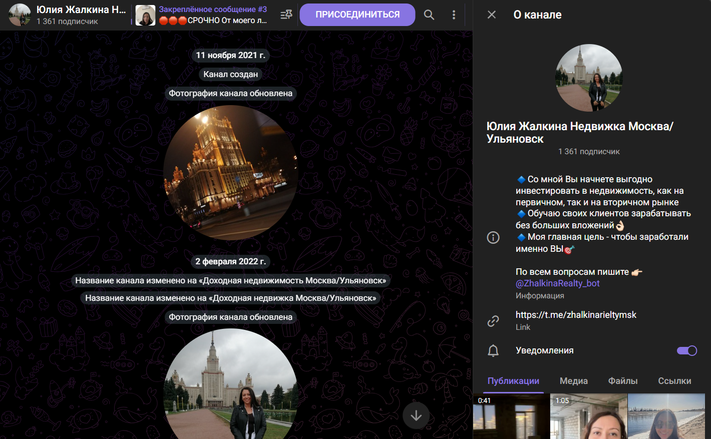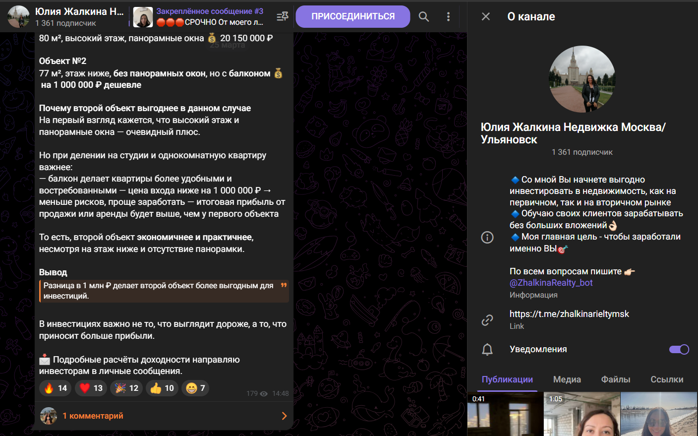 Утверждается, что Юлия Жалкина – риелтор и инвестор с более чем 12-летним опытом работы в сфере недвижимости. Она рекомендует выбирать объекты в Москве, Ульяновске и других регионах. В своих публичных каналах Юлия: