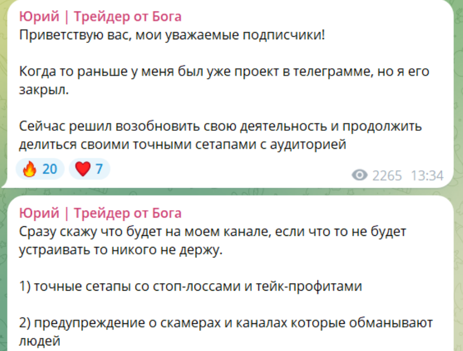 Канал создан в январе 2025 года, однако первая запись появилась в сентябре. Такой большой перерыв в деятельности проекта автора объясняет тем, что у него уже был канал, который он закрыл и затем решил возобновить работу. Удаление контента за весь период кажется достаточно подозрительным – так поступают жулики, которые пытаются скрыть следы своей деятельности. Юрий обещает давать точные сетапы, а также предупреждать о скамерах и каналах, которые обманывают людей. Однако фактические действия Юрия выдают его с головой.