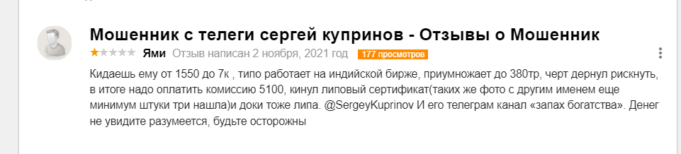 Очередной псевдоэксперт, скрывающийся за ником Sergey Kuprinof, обещает баснословные прибыли на арбитраже криптовалют, но на деле выманивает деньги под предлогом «комиссий» и «налогов». Отсутствие лицензий и поддельные документы – явные признаки мошенничества. Не дайте себя обмануть!