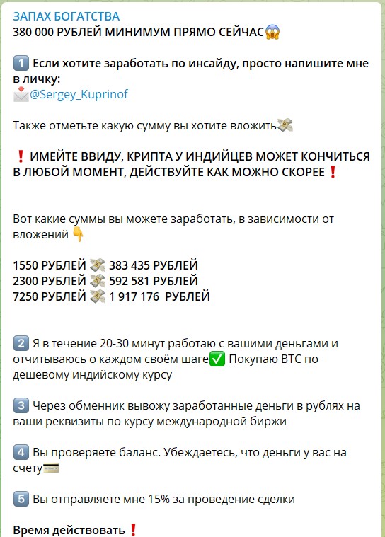 Админ тг-канала «Запах богатства» Sergey Kuprinof обещает быстро увеличить капитал через арбитраж криптовалюты между биржами. В этом материале смотрим, насколько эти заявления совпадают с реальностью и что происходит с деньгами подписчиков. Разберемся, какие риски скрыты за обещанной доходностью, проверим личность основателя и подведем итоги.