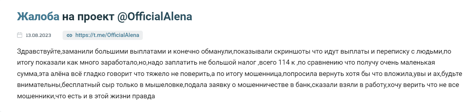 Есть отдельные комментарии, в которых канал Oficiai Alena хвалят за «быструю выплату», однако такие отзывы публикуются скрытыми профилями внутри самого канала.