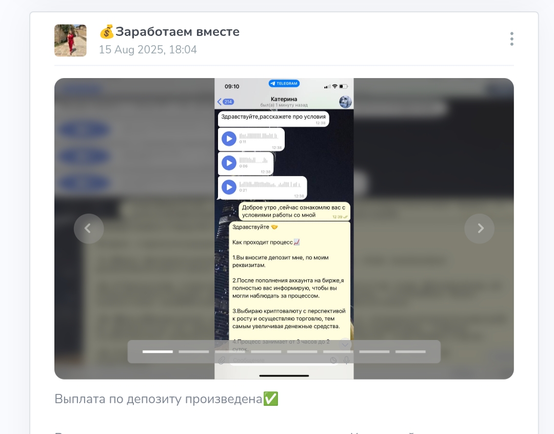 В открытых источниках преобладают негативные упоминания канала «Заработаем вместе». Люди пишут, что перевели средства админу, после чего получили скрины с фантастической доходностью и требование доплатить. Те, кто соглашался, теряли обе суммы; те, кто отказывался, сталкивались с молчанием либо блокировкой.