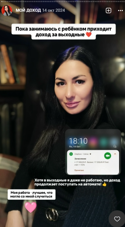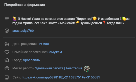 Девушка ведет сообщество в ВК, а также канал на Ютуб. На своем персональном аккаунте в ВК она также рекламирует образовательный проект, с которым работает. Девушка утверждает, что была целым директором в сетевом, но теперь получает доход на фрилансе, зарабатывает миллионы рублей в год без специальных навыков.