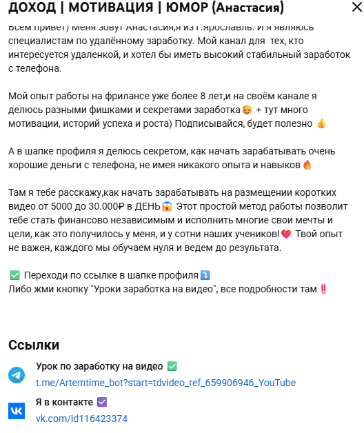 Несмотря на то, что девушка рассказывает о заработке на видеороликах, она не предлагает пользователям собственные курсы, методички или какие-либо другие материалы. Чтобы понять, к чему сводится предложение, достаточно просто прочитать описание сообщества: