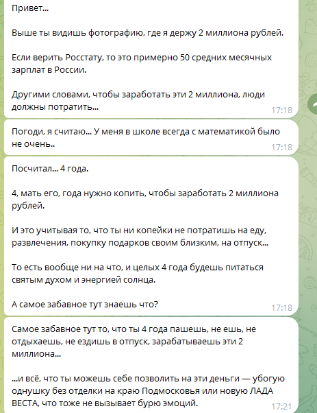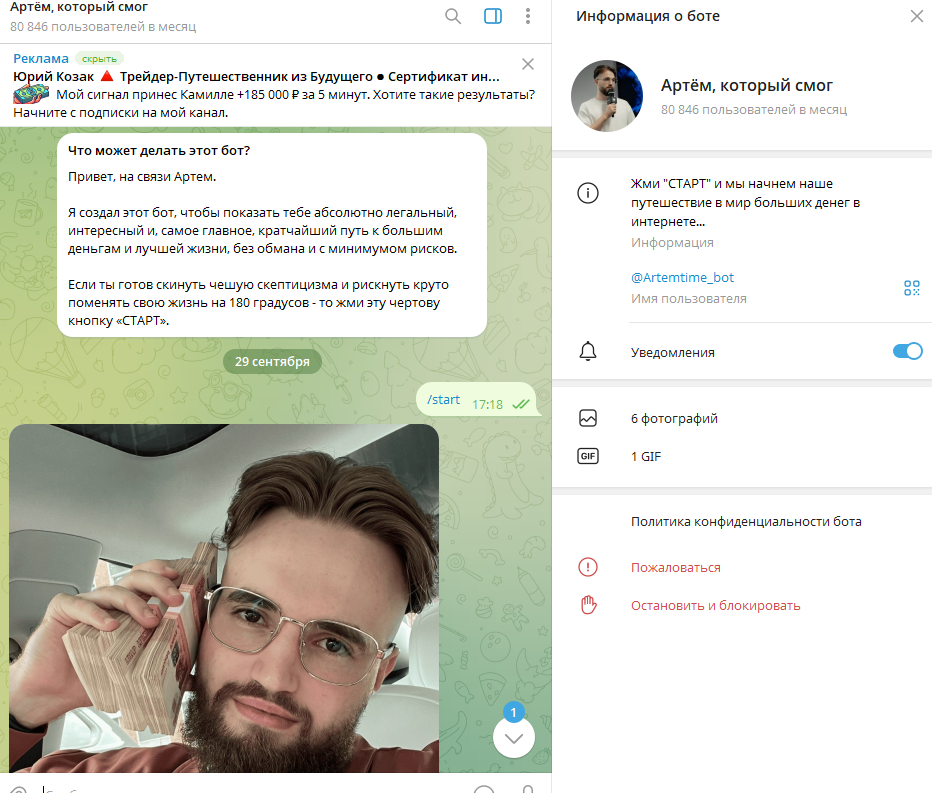 То есть Анастасия просто делится реферальной ссылкой на бота Артём, который смог. В боте молодой человек рассказывает о том, как легко зарабатывать на чужом контенте. При этом попутно используются избитые инфоцыганские приемы: рассказы о сверхдоходности при минимуме усилий, давление на читателя, истории про несчастную прошлую жизнь в найме, и, конечно, «звонки» по толстым пачкам денег: