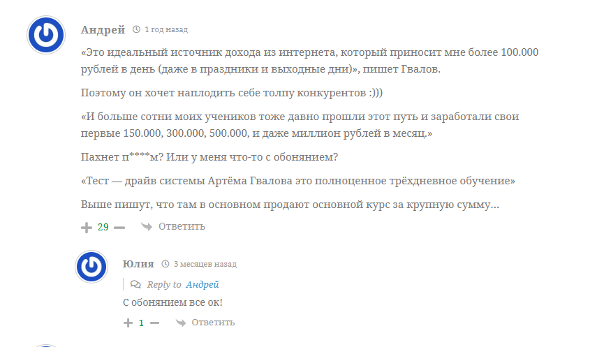На независимых платформах об Анастасии отзывов нет. Это может быть связано с тем, что она просто продает продукт, занимается рефоводством. А вот об Артеме Гвалове и его системе, которую так активно продвигает Анастасия, представлено огромное количество негативных комментариев: