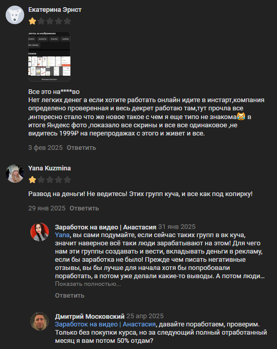 В сообществе Заработок на видео Анастасия есть открытый раздел для отзывов. Вот только их честность вызывает большие сомнения, так как многие положительные оценки были загружены почти в одно время:
