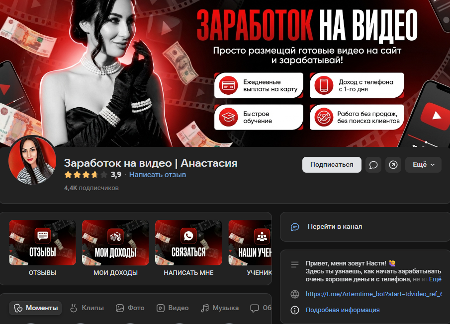 В своем сообществе Анастасия также рассказывает о том, что с первого дня получает деньги на видео, и для этого, якобы, ничего не требуется: ни ведение социальных сетей, ни продажи.