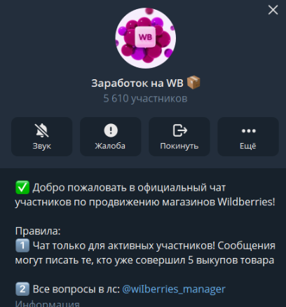 В описании канала написано: «Официальный чат участников по продвижению магазинов Wildberries». Правила строгие – писать могут только те, кто сделал 5 выкупов. Новички читают, но молчат до выполнения условий. Суммы заданий – от 2 000 до 200 000 рублей. Для аукционных товаров обещают выплату 100% от вложений.