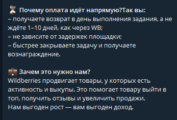 В чате объясняют причину прямых платежей. Через маркетплейс возврат идет до 10 дней. Прямая оплата якобы ускоряет расчеты – деньги приходят в день выполнения задания. Wildberries в сделке не участвует. Как тогда накручиваются покупки на WB – непонятно.
